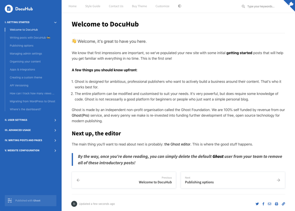 Get your Documentation site setup in a flash with this clean, feature packed theme for the Ghost blogging platform. It is fully responsive and loads blazing fast (100% Page Speed & SEO Score)!